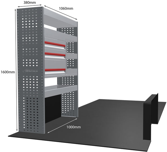 De exacte afmetingen van de stelling vindt u in de eerste foto. Deze zijn specifiek ontworpen om de ruimte in uw bedrijfswagen optimaal te benutten.