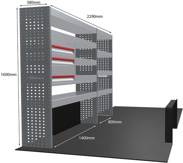 De exacte afmetingen van de stelling vindt u in de eerste foto. Deze zijn specifiek ontworpen om de ruimte in uw bedrijfswagen optimaal te benutten.
