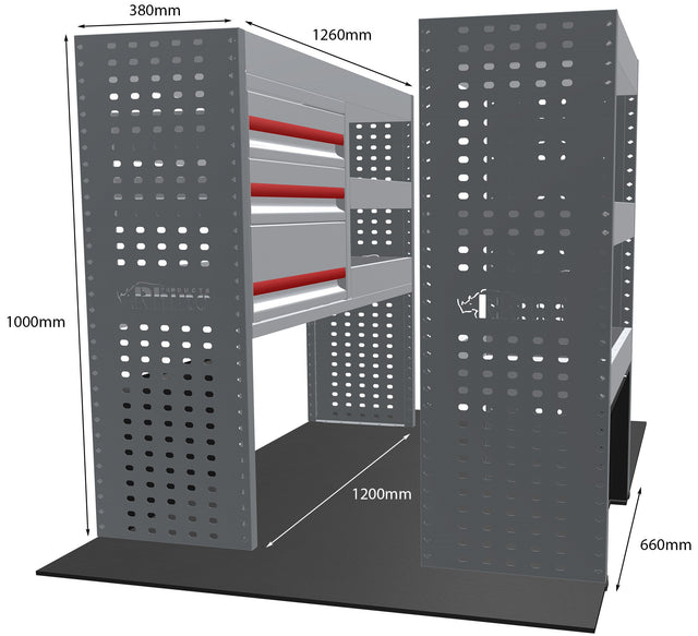 De exacte afmetingen van de stelling vindt u in de eerste foto. Deze zijn specifiek ontworpen om de ruimte in uw bedrijfswagen optimaal te benutten.
